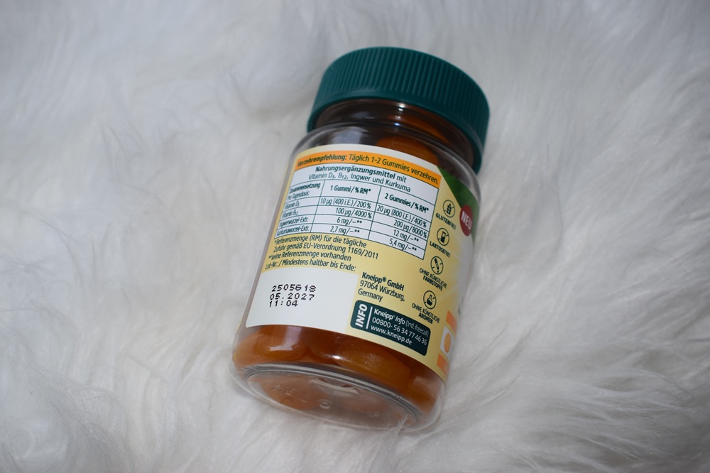 Die D3 + B12 Gummies von Kneipp enthalten pro Gummi 800 i.E. D3, 200 μg B12, Ingwer und Kurkuma. Die maximale Menge sollte 2 Gummies pro Tag nicht überschreiten. Die Gummies schmecken nach Orange-Ingwer und dieser fruchtig-scharfe Geschmack ist herrlich erfrischend. Das Nahrungsergänzungsmittel ist Glutenfrei, Laktosefrei, ohne künstliche Farbstoffe und Aromen.
